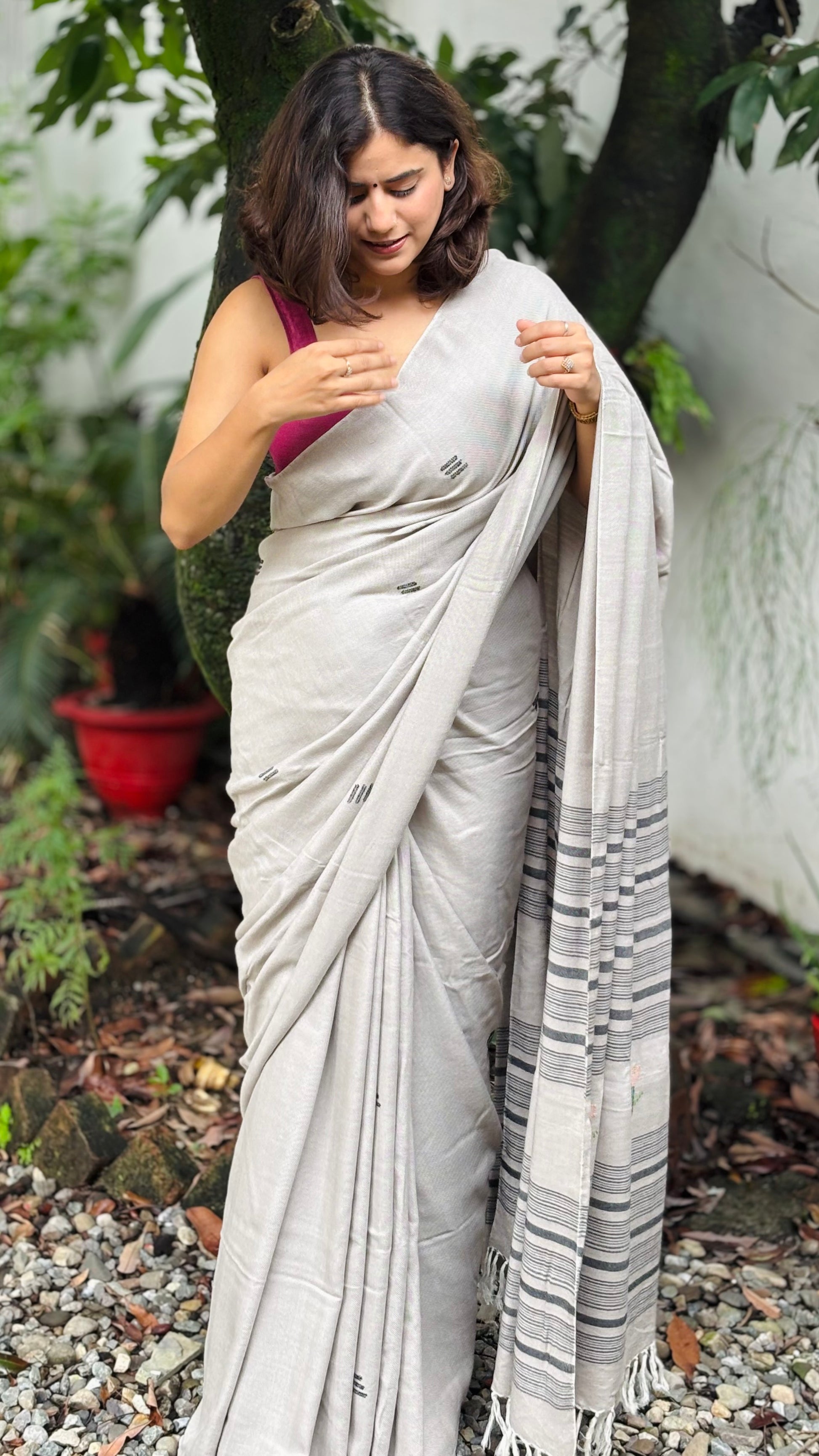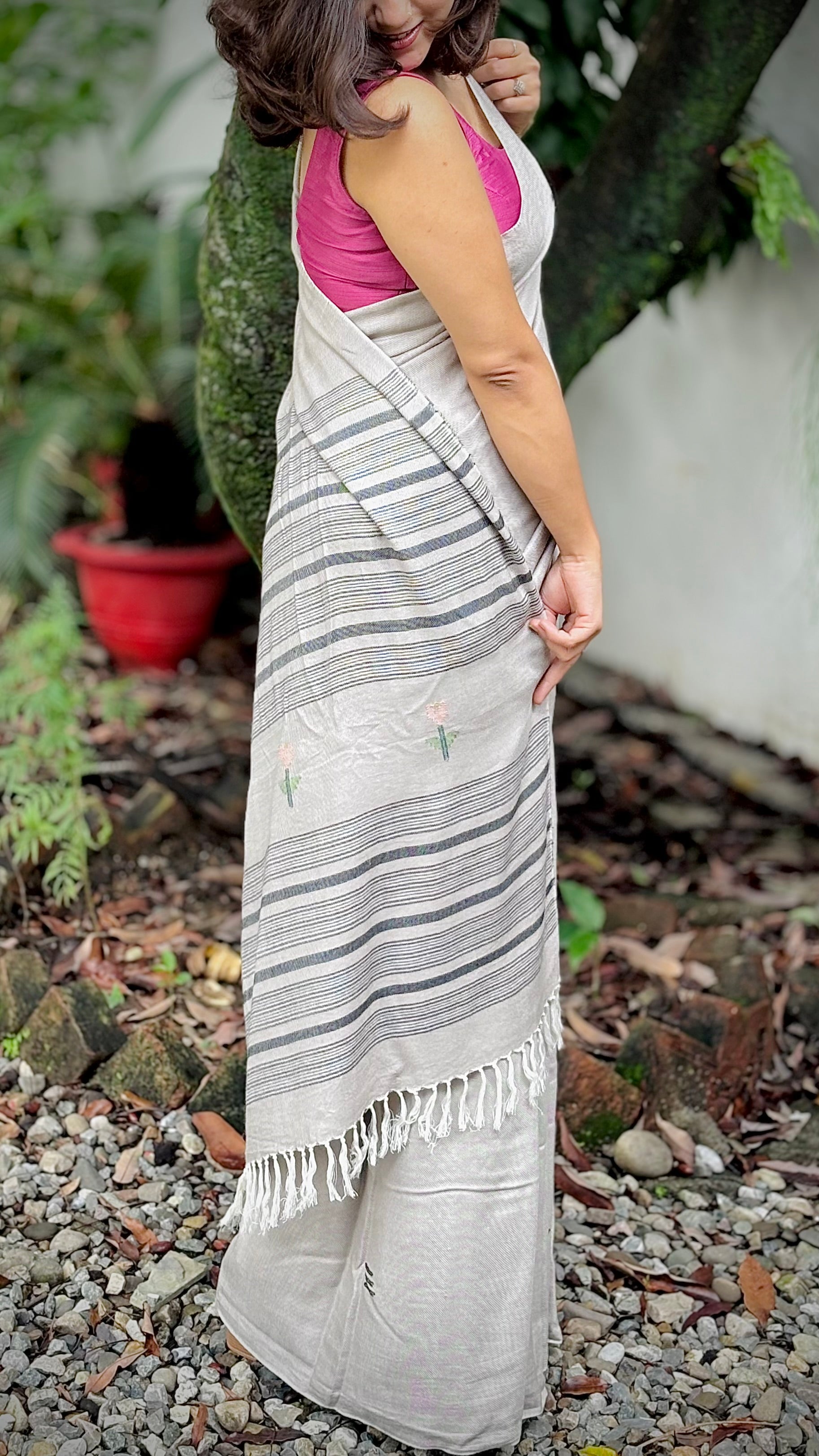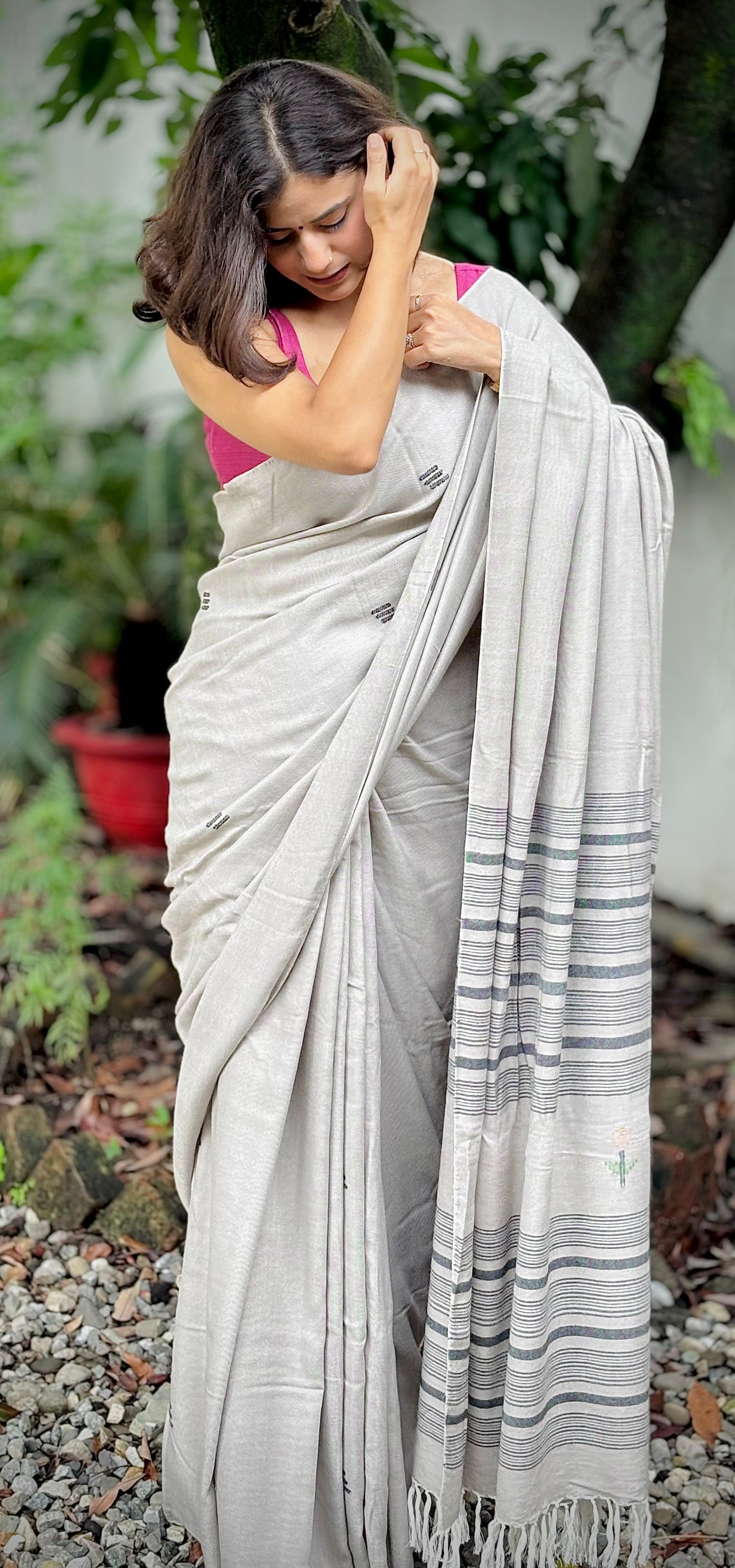 Handwoven grey saree with subtle motifs on the body and striped pallu. Its superior quality weave offers a graceful fall and unmatched comfort.
